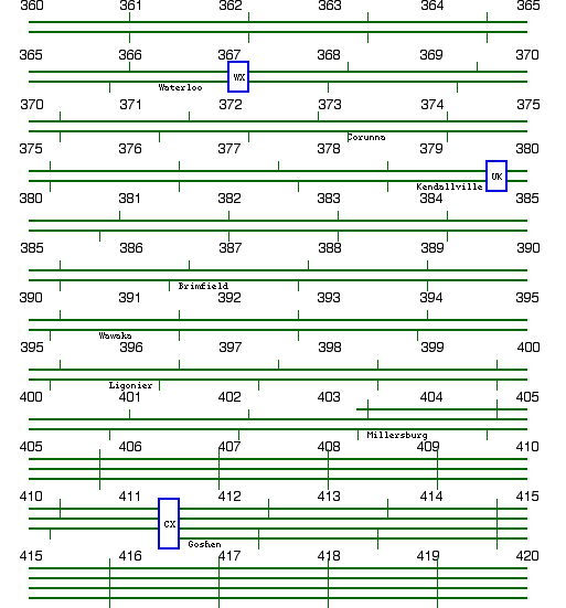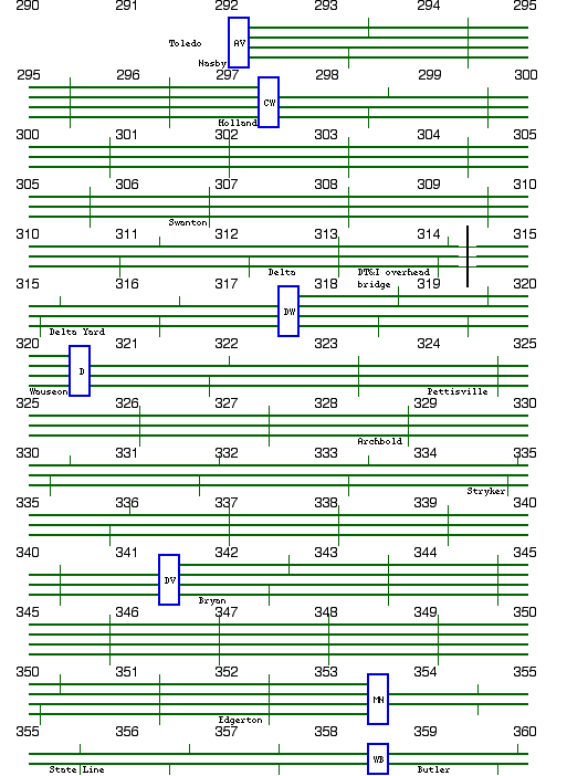 Former New York Central main line between Toledo and Elkhart. At the time, much of the route had four tracks. Where three or four tracks existed, the inner tracks were used by passenger trains, and the outer tracks were used by freight trains.