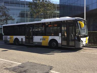 Outside the Brussels South Station is a bus terminal. In Belgium, French is spoken in the south part of the country and Dutch is spoken in the north part of the country. The regional bus system serving the Dutch part of the Country is "De Lijn" (The Line).