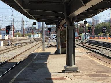 Looking north at Brussels South Station, with unique Belgian railway signals.