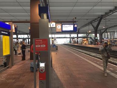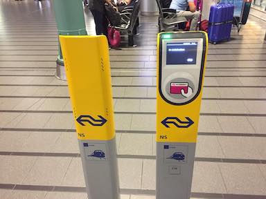 At some stations including Amsterdam Schiphol Airport, there are no gates, just these posts with touch pads which read smart cards. If there are no gates, one must remember to check in and check out with the card. This also applies to streetcars and buses, one must check in when boarding and check out when exiting.