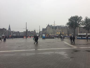 One final ride into Amsterdam Centraal Station. This view is from the station looking across the station plaza. A streetcar is to the right, and a stairway down to a Metro (M) line is also visible.