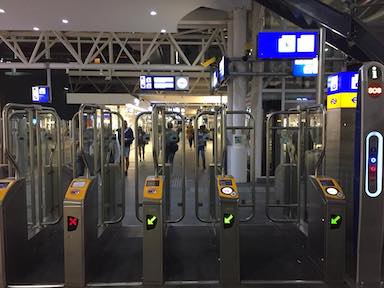 Major railway stations now have gates like these, which require a smart card to pass through. I had taken this photo a few days earlier in Leiden.