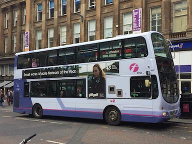 Typical Glasgow bus, operated by First Group. Which is based in Scotland, and in the US owns Greyhound and has numerous transit management and school bus contracts.