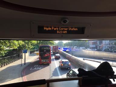 The best place to ride a London bus is on the upper level in front. Unlike the old Routemaster buses, these modern buses include digital "next stop" signs.