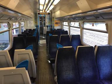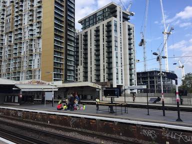 I rode an Overground train from Stratford to Hackney Central. Where a transfer connection is available to the pictured Hackney Downs station, where I would ride a train into Liverpool Street station. The Overground trains, like the Underground trains, had sideways seats.