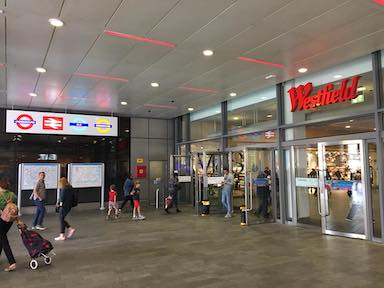 I eventually made it to Stratford, east of London and the main location of the 2012 Olympics. A large indoor mall is there. But unlike most malls in the US, this mall is conveniently served by rail transportation. The Underground, main line trains, a light rail line, and the "Overground" which basically is Underground type service over main line railways. The Westfield mall management company also applies its name to malls in the US.