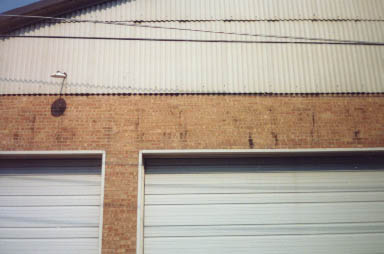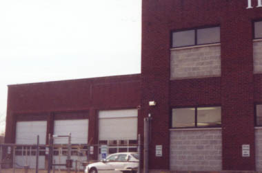 Next stop was Aurora, and in search of evidence of the original and later (1925) car houses, using maps from "The Great Third Rail", The Central Electric Railfans' Association (CERA) Bulletin 105. There was no evidence of the original car house at Water St. and Benton St. But on River St., on the east side of the street and near the location indicated on the CERA map, a building remains standing which looked like it could have been built in 1925, and shaped like the car house shown on the CERA map. That building is now used by NICOR, the local natural gas company, as a garage for its vehicles. The address is 424 S. River St. The portion of the building immediately next to River St. was not the portion with actual streetcar tracks.