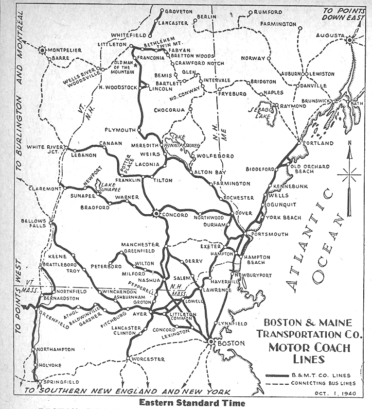 Formed 1924 as bus subsidiary of Boston & Maine Railroad, from 1952 to 1957 was Trailways member, sold 1957 to Transcontinental Bus System/Continental Trailways.