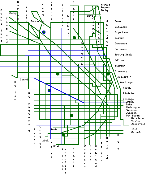 Green circles indicate CTA bus garages. In addition, North Ave. and Forest Glen housed the remaining trolleybuses, as indicated by the multicolored circles.