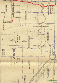 Heavy red lines indicate rapid transit, thin solid green lines indicate streetcar lines, thin dashed green lines indicate bus and trolleybus lines, thin solid blue lines indicate Chicago Motor Coach routes, thin dashed blue lines indicate Chicago and West Towns Railway routes.