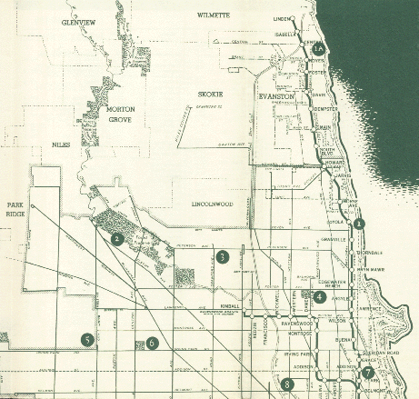 Heavy lines indicate rapid transit, thin solid lines indicate streetcar and bus lines, dashed lines indicate Chicago Motor Coach routes. Also shown are routes of the Evanston Bus Company.