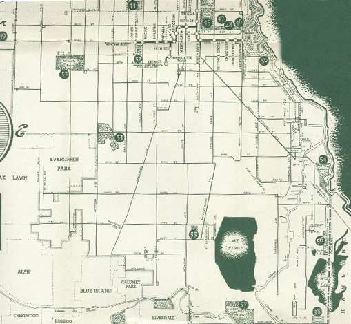Heavy lines indicate rapid transit, thin solid lines indicate streetcar and bus lines, dashed lines indicate Chicago Motor Coach routes.