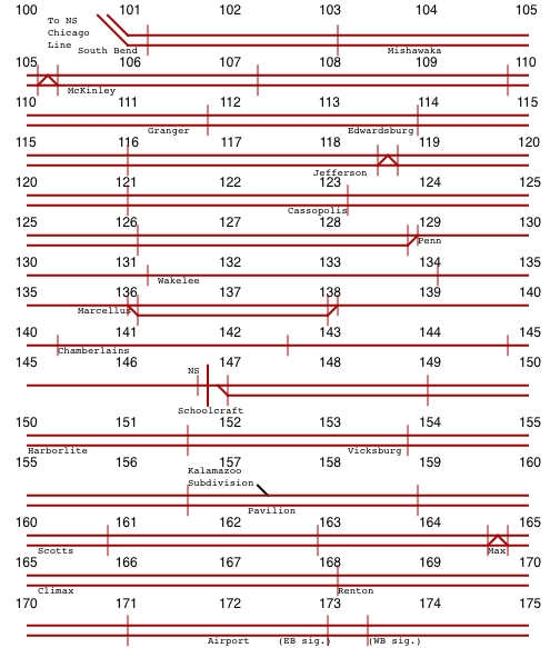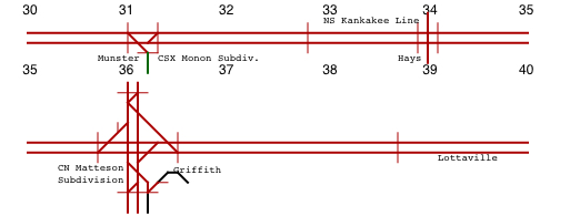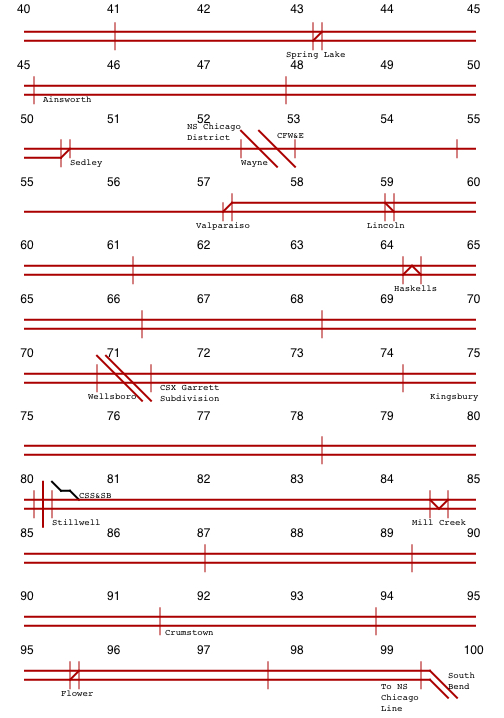 Originally, the only single track segment was between Sedley and Valparaiso, with CTC installed in 1933. West of Munster, line in 2013 was transferred from CN to CSX control, with the shift of more CN traffic to the Matteson Subdivision (former Elgin Joliet & Eastern) west of Griffith.