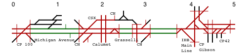 Line connects with NS former New York Central line at Indiana Harbor area, and operates south connecting with NS former New York Central Kankakee Line at CP Gibson.