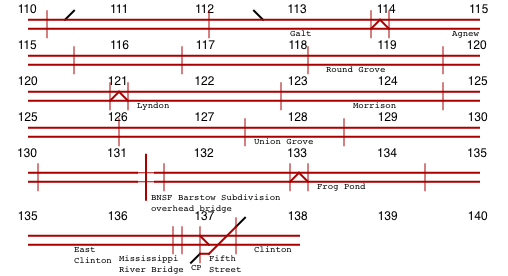 Between Bluffs and East Clinton, the double track line originally followed a more circuitous route further north, passing through Fulton. In 1909, the present more direct line opened, and the original route was downgraded and mostly abandoned in 1939. Fulton was measured at milepost 135.5 and East Clinton via this route was at milepost 136.5.