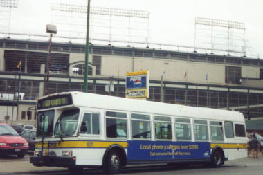 In the year 2000, Pace received new low floor Orion VI buses. Bus #6011 is seen at Wrigley Field, on the special bus route operating from Schaumburg for Chicago Cubs baseball games.