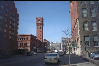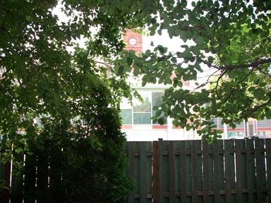 South of the building, where the tracks were, a park now exists. View is looking through the trees in the park, towards the clock tower.