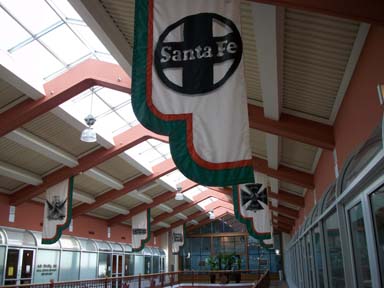 The only hint of railroads at Dearborn Station are these banners above the balcony of the interior. Some banners for railroads which former served the station, including Santa Fe, and other banners for railroads which never historically served the station.