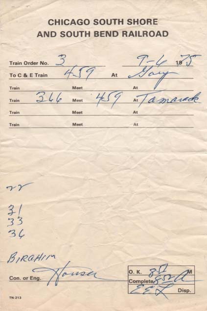 Meet order for the single track segment east of Gary, which included spaces to fill in the meet information. This meet would be at Tamarack.