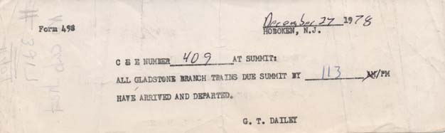 On the former Lackawanna electrified lines in New Jersey, trains entering the single track Gladstone Branch required confirmation that all opposing trains have arrived and were out of the way. But such confirmation was less formal than the traditional train order, simply using this message form.