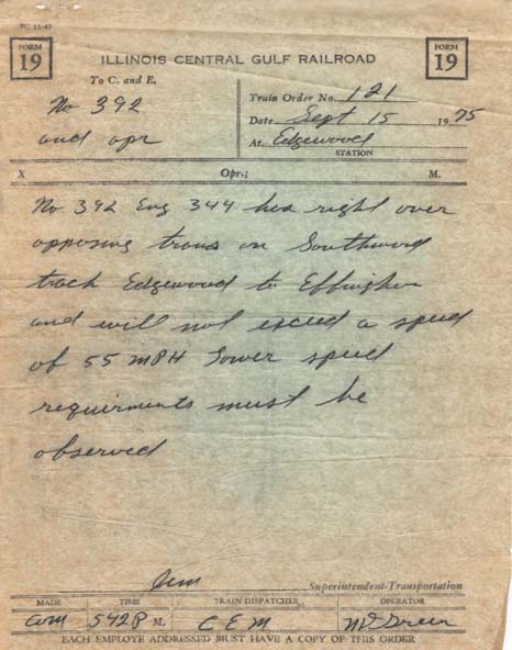 In 1975, the Illinois Central main line was poorly run, with a pathetic on time record for Amtrak. This order provided for a segment of left hand running, restricted to 55 mph instead of the customary 90 mph with cab signals for normal right hand running. This was before Amtrak received any F40PH locomotives, Engine 344 was a former Burlington E8. The train order paper was originally green, faded over time.