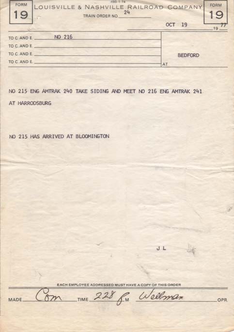 Order confirming meet involving Amtrak's Floridian at its regularly scheduled meeting point at Harrodsburg. Louisville & Nashville for its operation assigned the Floridian train numbers 215 and 216. In fall of 1977, Amtrak F40PH locomotives starting with #230 were newly delivered, and operated briefly on the Floridian with steam generator cars. During most of that time, the Floridian used SDP40F locomotives.