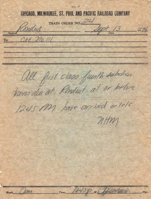 On the Milwaukee Road commuter line from Chicago to Fox Lake, Rondout is where trains switched from the double track main line to the single track secondary line. And at Rondout, this form of train order would confirm, that all opposing trains have arrived and were out of the way. The train order paper was originally green, faded over time.
