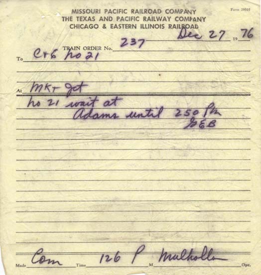 Missouri Pacific had well maintained track. But for reasons which did not make sense, the railroad did not have the customary situation where passenger speed limits were higher than the freight train speed limits. Despite the good track, Missouri Pacific limited Amtrak to 50 mph. Nevertheless, I was clocking the train at 70 mph. Until we came to a sudden stop by Adams siding, on the north side of San Antonio. And we waited for a few minutes, before continuing on. And once I got a hold of this order, I learned why. This order was issued at MKT Jct., near San Marcos. And may have been a tactic, to make Amtrak STAY late.