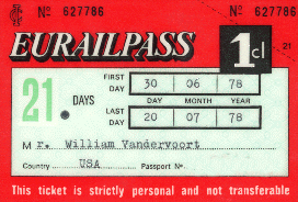 I used Arnhem as a base for further travels within the Netherlands, along with a trip into Brussels, Belgium. My Eurailpass had been validated at the Bergen Norway train station on June 30 and would expire on July 20, one day before the flight back to Chicago. But the agent in Bergen first wrote in an expiration date of July 30, then wrote over it with the correct date for a 21 day pass. This had not been a problem until July 17, when I was riding on a branch line at the extreme northeast corner of the Netherlands, near Groningen. A conductor on that train decided that this was improper, so he confiscated the pass and instructed me to go directly to the railway headquarters in Utrecht. The conductor gave my pass to the conductor of a connecting train at Groningen, and he gave it to the conductor of a connecting train at the town of Amersfoort, and that conductor gave it to a railway official in Utrecht. This unplanned trip from Groningen to Utrecht took about two hours, and there I was issued a proper Eurailpass for the remaining few days. And on July 19 my parents flew in to Amsterdam from Ireland. The last couple of nights were in an Amsterdam hotel before the return flight to Chicago.