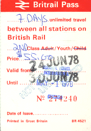 We stayed in London a week, and I managed to ride out some distance on most of the main lines out of London. London had eight major train stations serving intercity trains, with several other stations serving just commuter trains. London has a comprehensive commuter train network with various branch lines, and most of the main lines have four tracks to accommodate both local and fast trains. On most of those lines the two pairs of tracks are divided by speed instead of direction. For example, on the main line west from Paddington Station to Reading, the south pair of tracks is for fast trains and the north pair is for slow trains. It is on this line where I rode the 125 MPH diesel trains, which had been recently introduced. These are the smoothest trains which I have ever ridden, as I was clocking 28 seconds between mileposts. I also did a bit of riding on London's subway system, officially known as the Underground and informally known as the "Tube." The Underground is a fascinating network of many routes crisscrossing at different levels, sometimes quite deep. When I was there there were eight lines and various branches. A ninth line, the Jubilee Line, was under construction. One time I got to do something I had gotten the idea for several years earlier: flip a coin. When approaching a transfer point: heads I stay on, tails I get off. If tails: flip again. Heads I switch to the Bakerloo Line, tails I switch to the Victoria Line. After that: heads I go east, tails I go west. And so on. So I spent an hour or two flipping these interesting British coins, but I didn't get very far. Nevertheless it was neat to be able to do this.