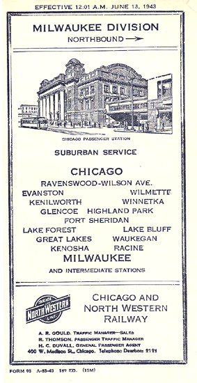 Portions of a 1943 timetable. Timetables for this line included trains to and from Milwaukee, until the discontinuance of those trains with the formation of Amtrak in 1971.