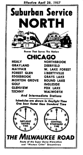 Portions of a 1957 timetable. At the time, a few trains operated beyond Fox Lake to Walworth, Wisconsin.